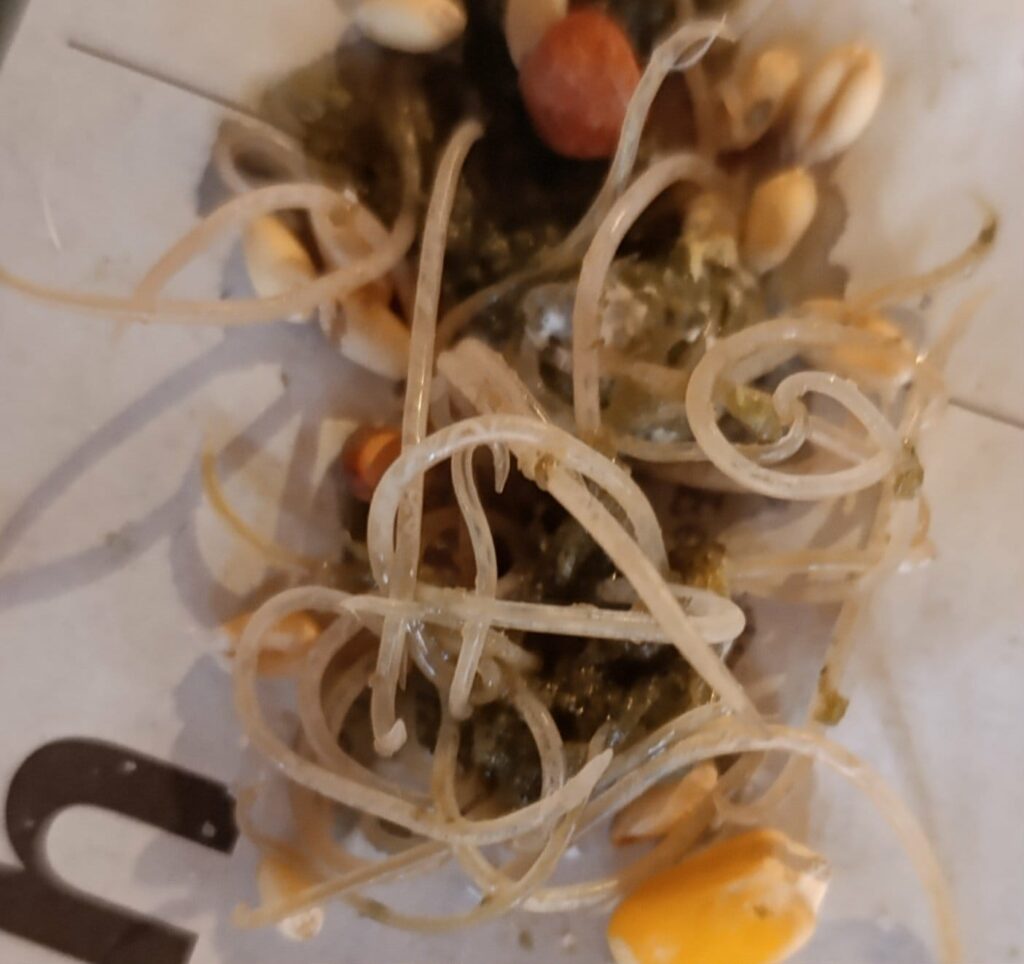 Es handelt sich um den Kot einer Taube – und die zahlreichen weissen Fäden darin sind Würmer.